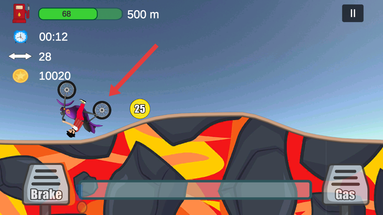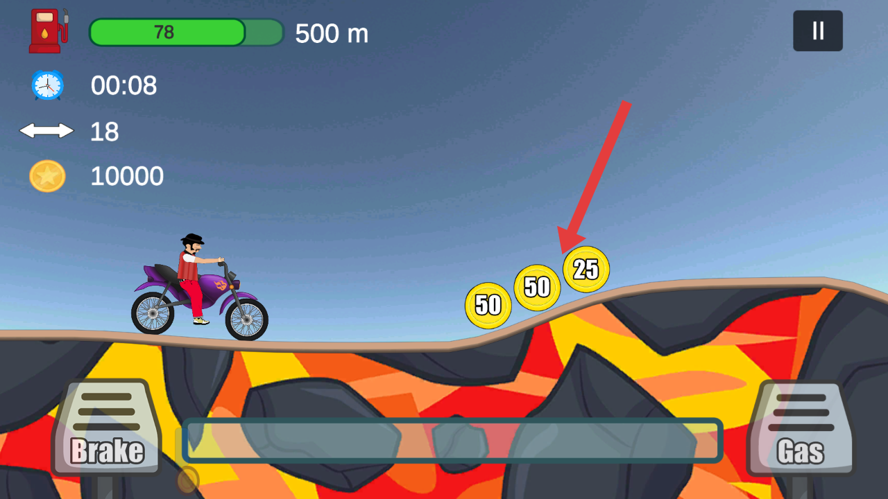 2、操控摩托车时,瞄准箭头指向的金币,通过油门Gas和刹车Brake调整车速,沿地形收集货币。