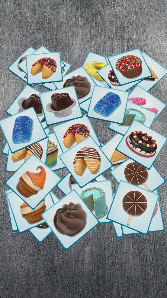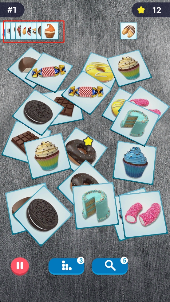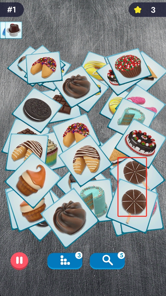 1、开局观察各类甜品卡牌,寻找相同图案,如红框内的巧克力棒棒糖,点击配对消除,优先消数量少、易找的组合。