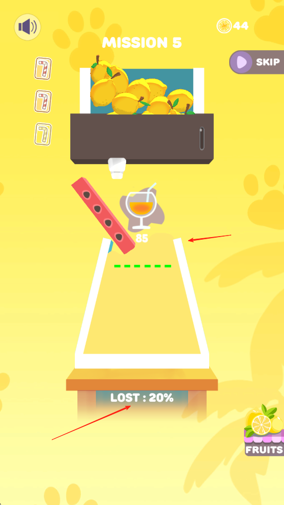 1、点击屏幕,榨汁机就会开始自动运作榨汁,榨出来的汁不能超过那条虚线,只要虚线变绿即可通关。