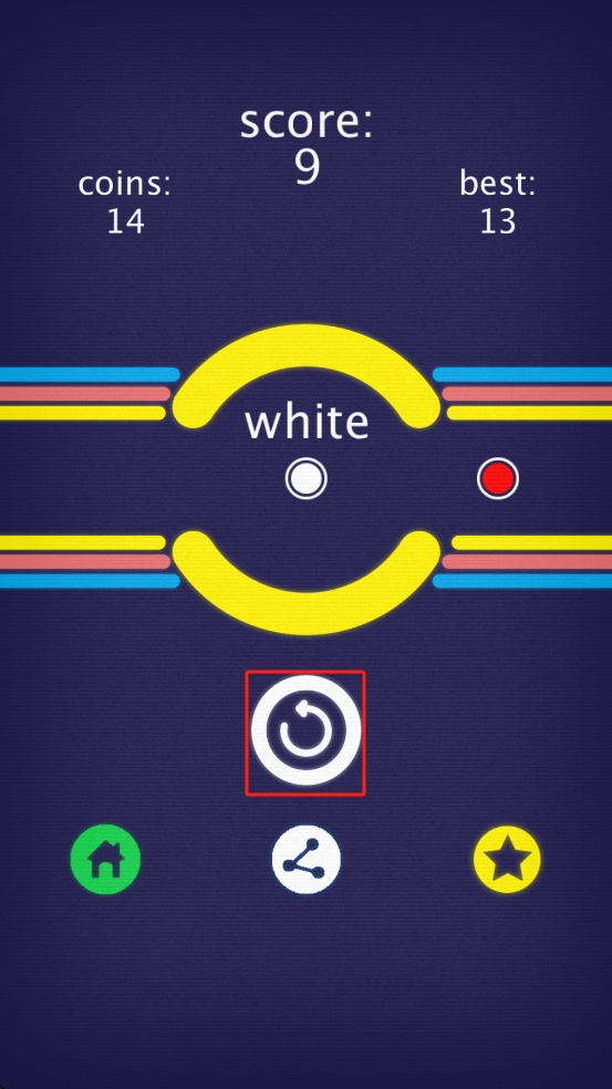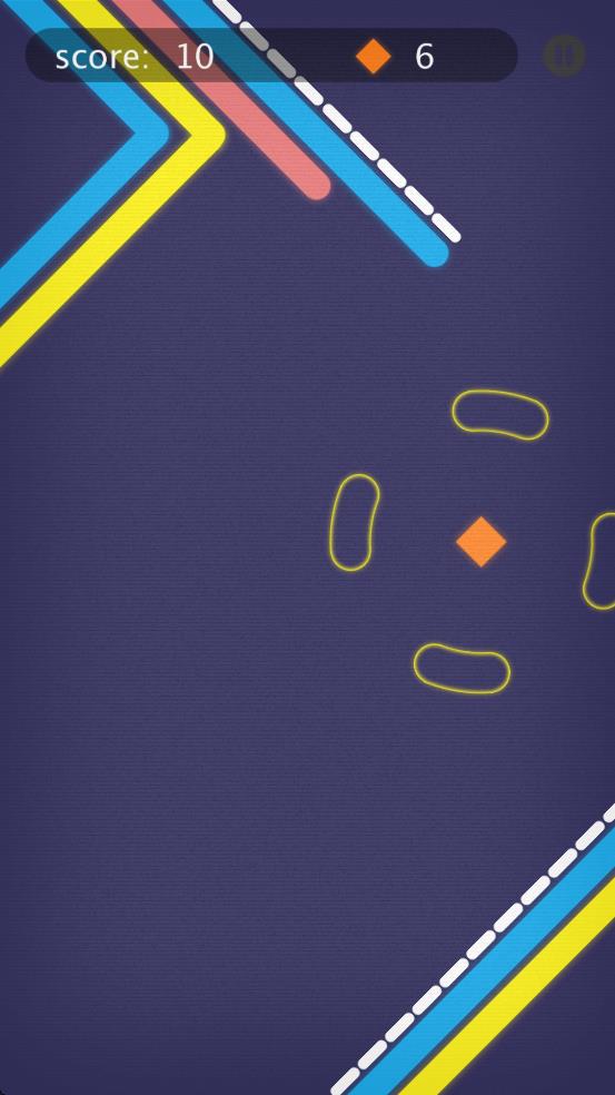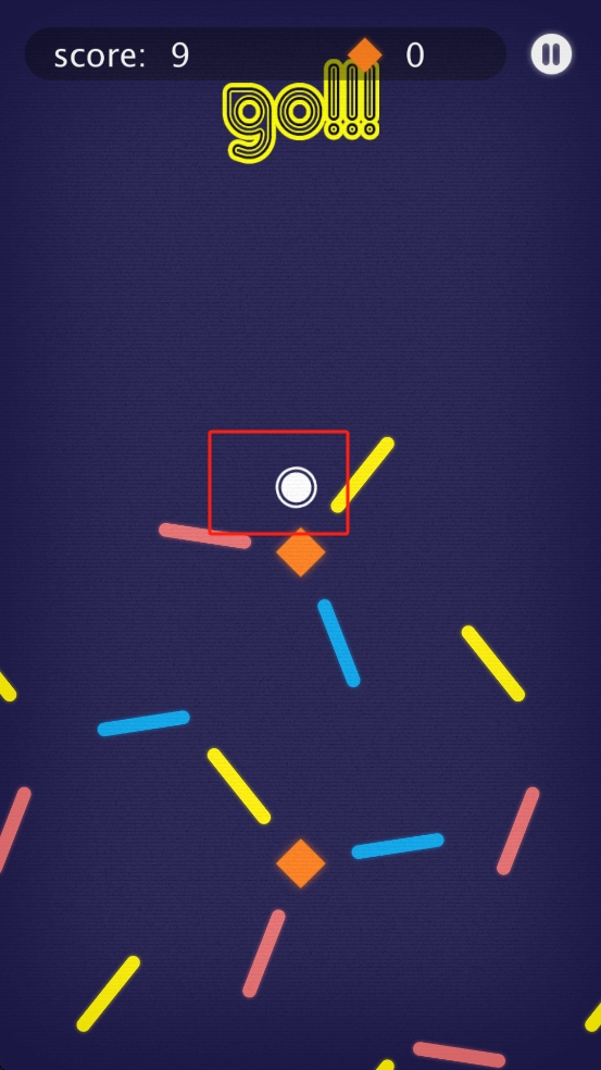 2、小球弹出后,躲避彩色长条与橙色方块,控制小球移动路径,持续碰撞得分,保持存活时间越长,得分越高。