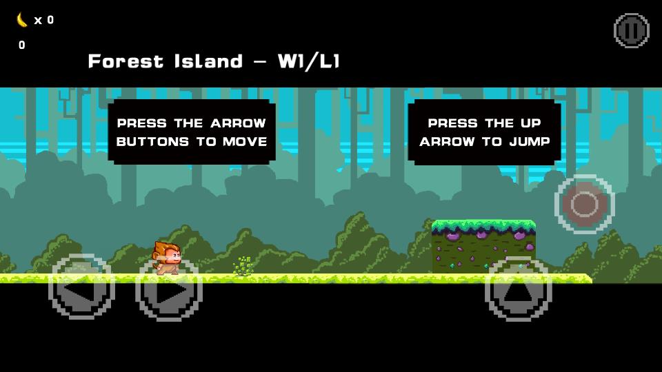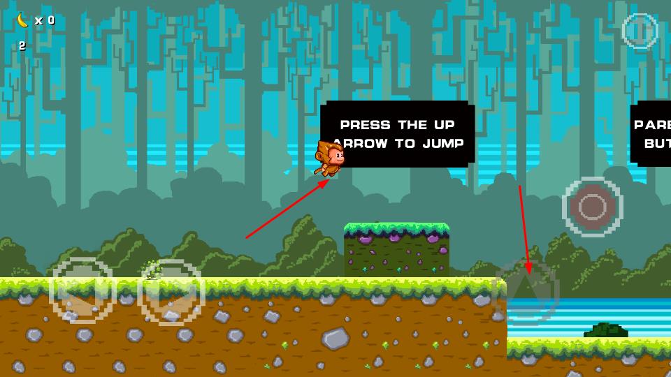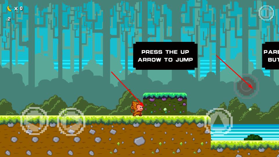 1、操控像素猴子角色,点击右侧虚拟跳跃按钮或按上箭头,使猴子跳跃过前方草地区域的障碍,遵循PRESS THE UP ARROW TO JUMP指引。