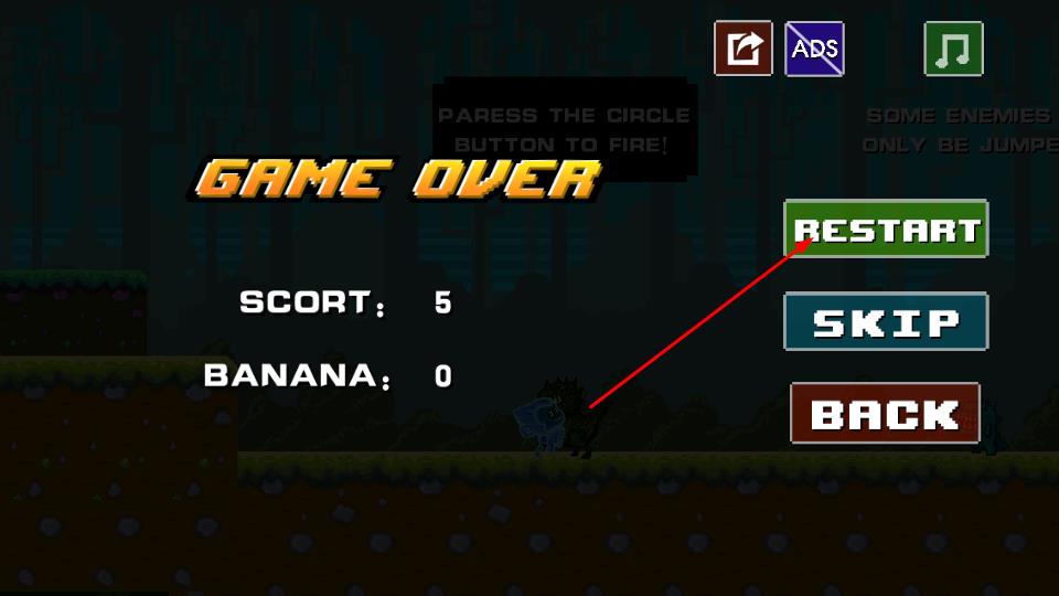 3、若挑战失败界面显示GAME OVER,可选择RESTART重新开始,或SKIP跳过bACK返回主界面,刷新分数SCORE与香蕉收集数。