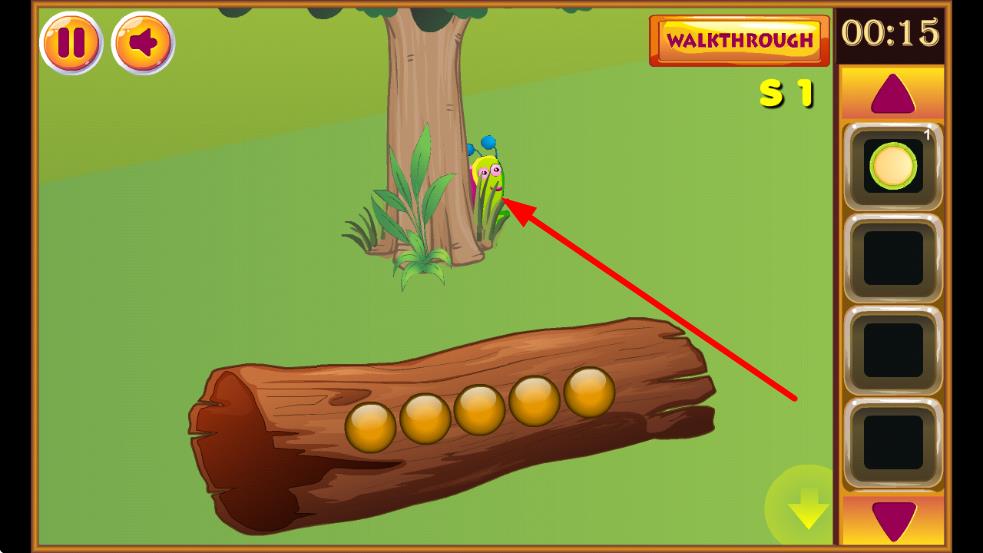 2、在S1关卡,按箭头指引,找到树旁草丛里的彩色虫子,收集它,留意木头上的金色圆球,用于解谜。