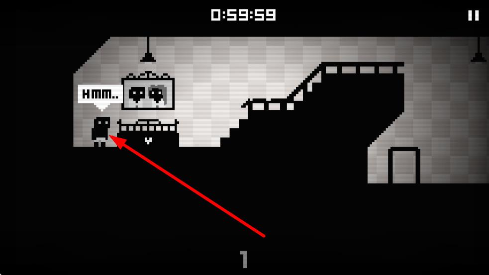 2、在限时场景中,操控角色向右移动,留意“Hmm..”气泡提示,探索房间,寻找线索或道具。