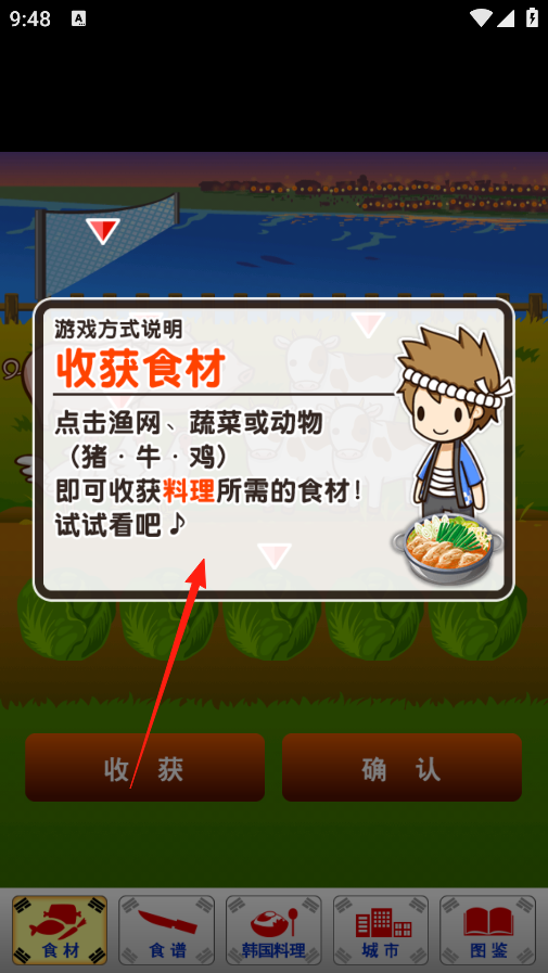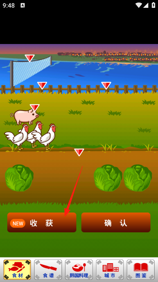 2、在农场场景,有猪鸡和蔬菜,上面都有红三角提示,点下方收获按钮,就能把这些带标记的食材收起来,收完看看收获了啥,确认没问题,点确认接着玩,积累食材好开发新食谱。
