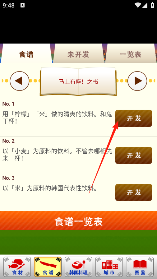 3、到食谱界面,选想做的料理,比如第一个用柠檬和米做的饮料,点右边开发按钮,消耗对应的食材,尝试做出新料理,就能解锁这道料理,加到自己的菜单里,以后随时做来用。