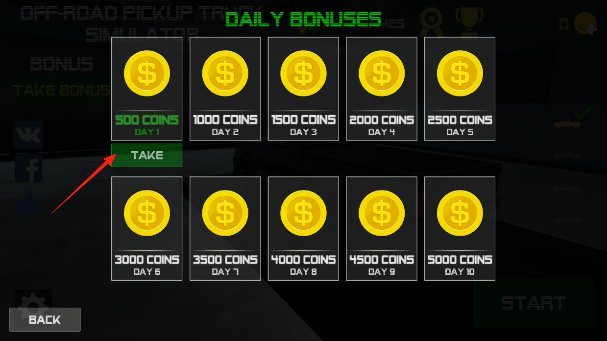 1、进入每日奖励界面,能看到不同天数对应的金币奖励,第一天有500金币,点TAKE按钮收下,这些金币可以用来升级卡车解锁新内容,天天登录领奖励,攒钱更快。