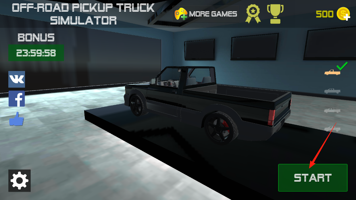 2、在车库界面,选好要开的皮卡车,点右下角START按钮,进入驾驶模式,开着车去越野,挑战不同路况,感受皮卡的性能,完成任务还能拿奖励,解锁更多车辆。
