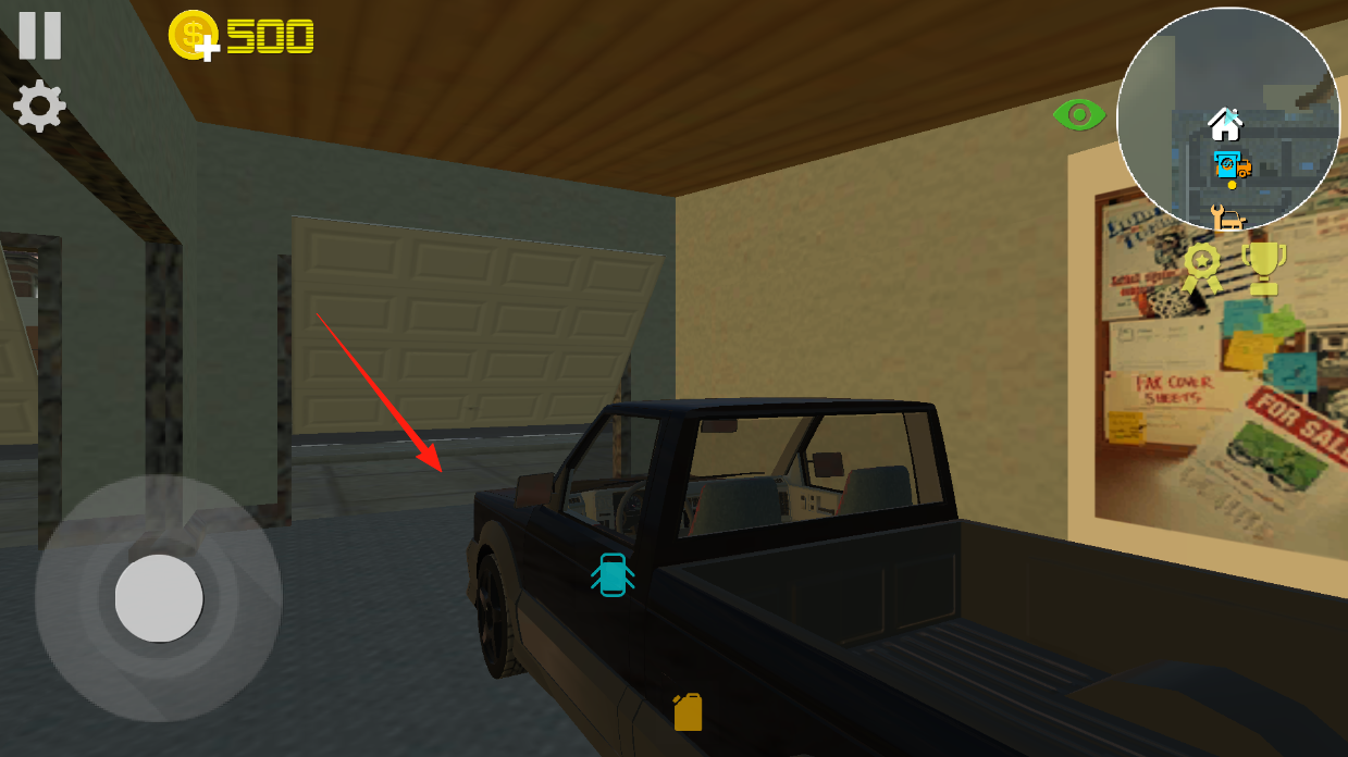 3、进入驾驶场景,用左下角虚拟摇杆控制皮卡车移动,把车开出车库,在地图里找越野路线,爬坡过障碍,体验越野乐趣,还能完成任务赚金币,给车升级改造。