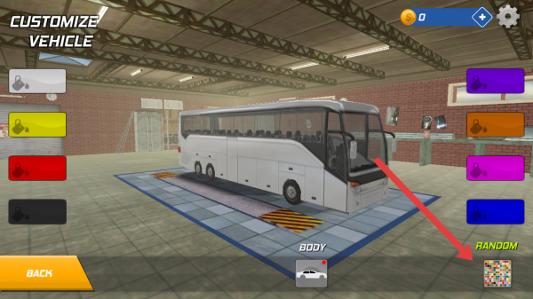 3、在车辆自定义界面,点击右下角RANDOM的按钮,随机切换巴士涂装,也可以选择左侧颜色块,自定义车身外观。