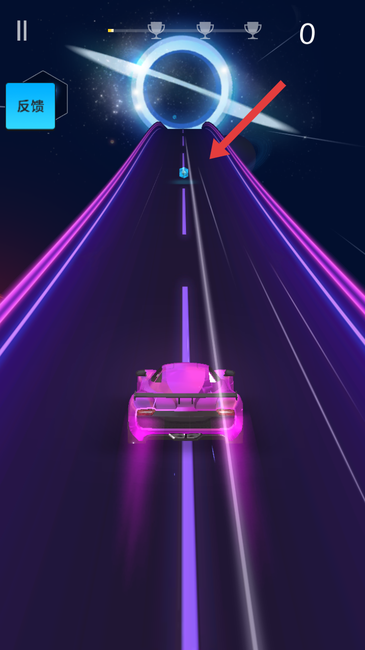 2、需要操控赛车沿着当前的紫色跑道行驶,瞄准前方不远的蓝色晶体,精准移动收集道具。
