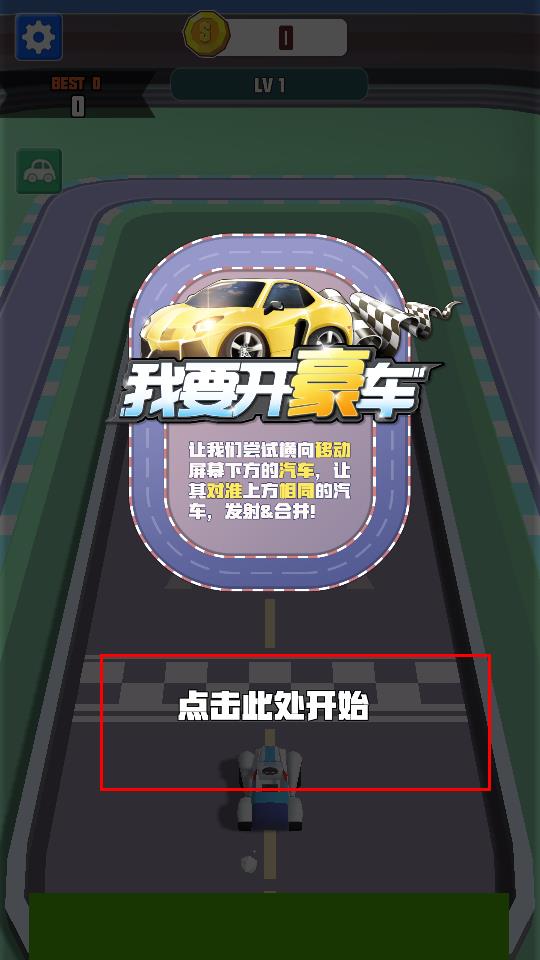 1、在游戏启动界面,点击点击此处开始区域,进入LV1关卡,开启汽车合并挑战,界面上方显示金币与分数信息。