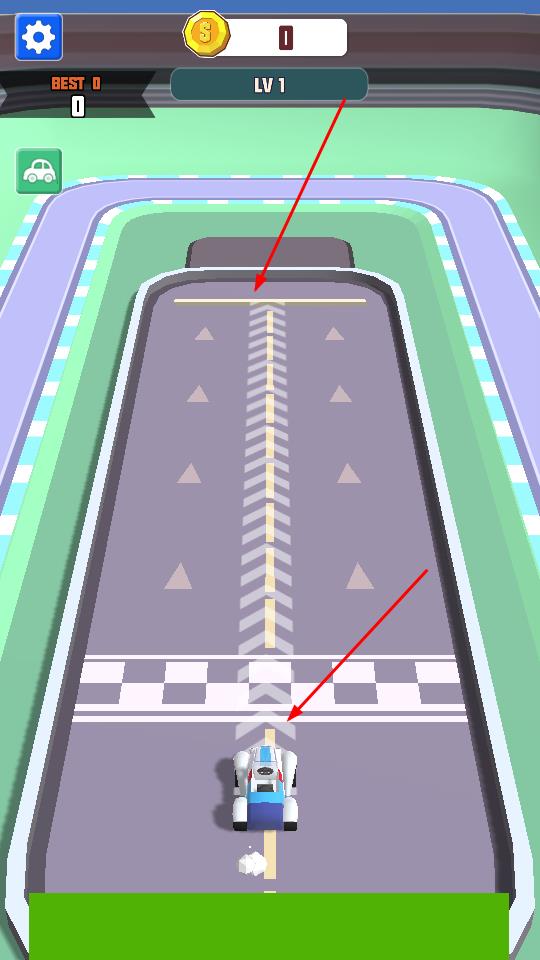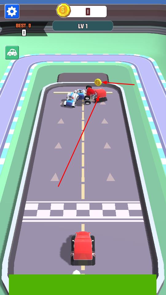 3、发射汽车,使其与上方同色汽车碰撞合并,升级车辆,同时收集轨道上的金币,提升游戏分数与进度。