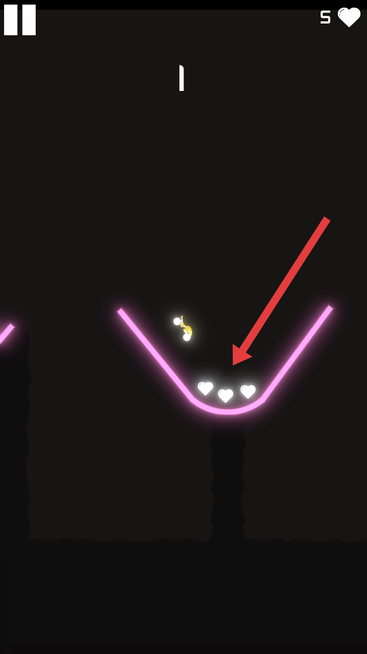 1、需要操控摩托车下落至箭头指向的爱心区域,收集心形道具,提升最后得分数,右上角显示爱心数值。