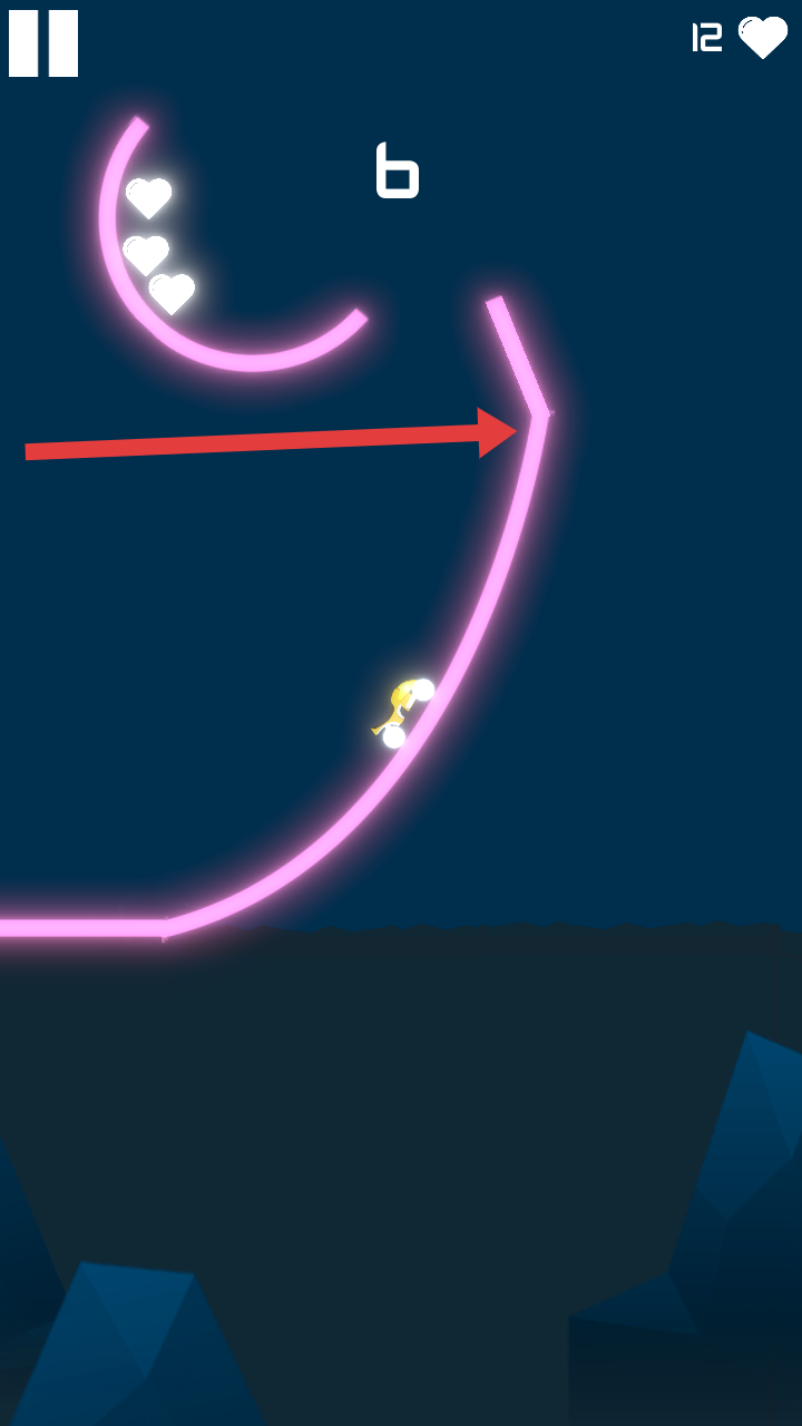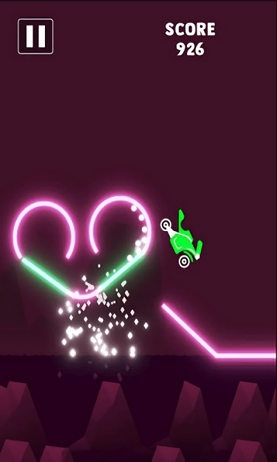 3、沿着霓虹的轨道爬坡,利用轨道的弧度来调整速度,顺利的通过转弯段,继续持续收集道路上的爱心。