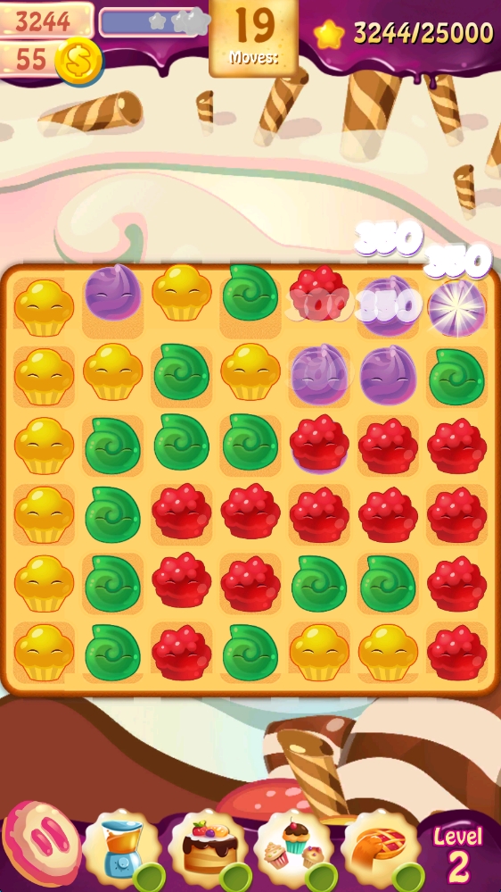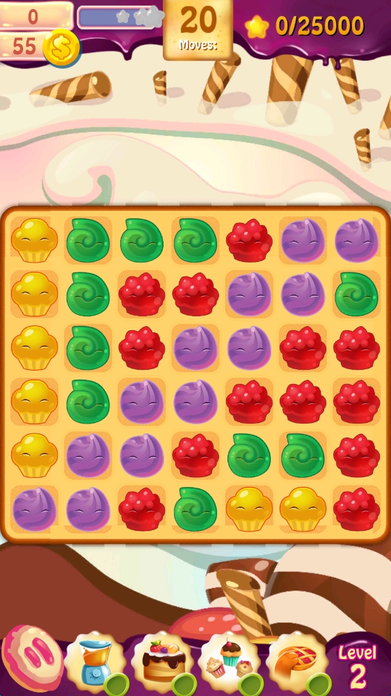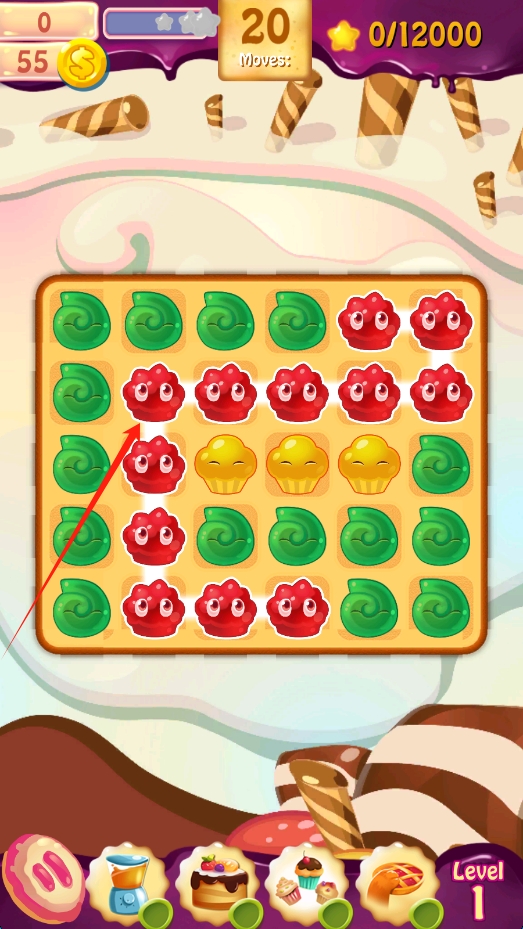 2、消除关卡中,在20步内,将红色蛋糕元素连成线消除,达成目标推进游戏。