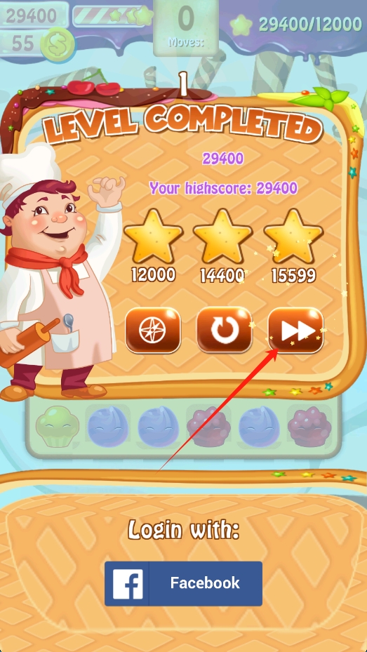 3、关卡完成后,点击箭头按钮,进入下一关,继续蛋糕消除之旅挑战更高分数。