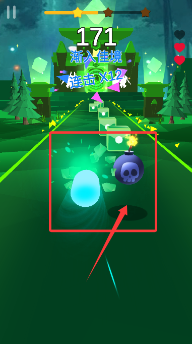 3、谨慎避开沿途的危险物,触碰炸弹将会中断当前连击记录。