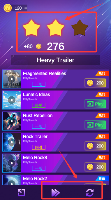 4、曲目结束后可查看星级评分,自由选择重玩或挑战新的乐曲。