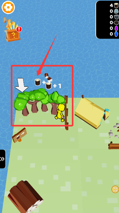 1、手持斧头走近林间树木,持续点击屏幕完成砍伐,收集散落的原木材料。