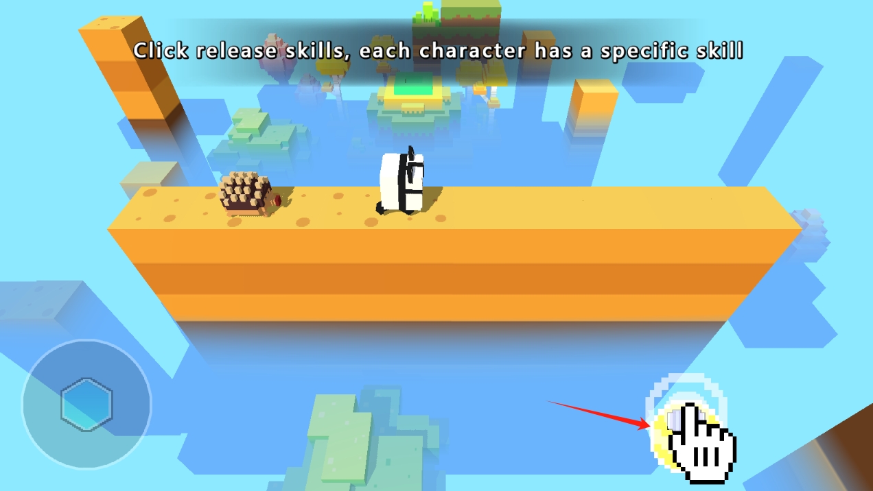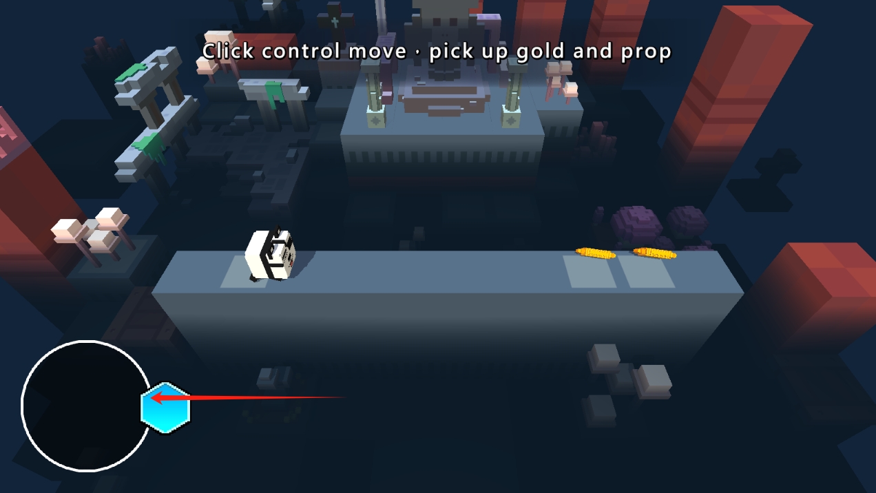 1、操作提示界面,拨动轮盘控制角色移动,在场景中灵活穿梭,拾取金币和道具,为战斗蓄力。