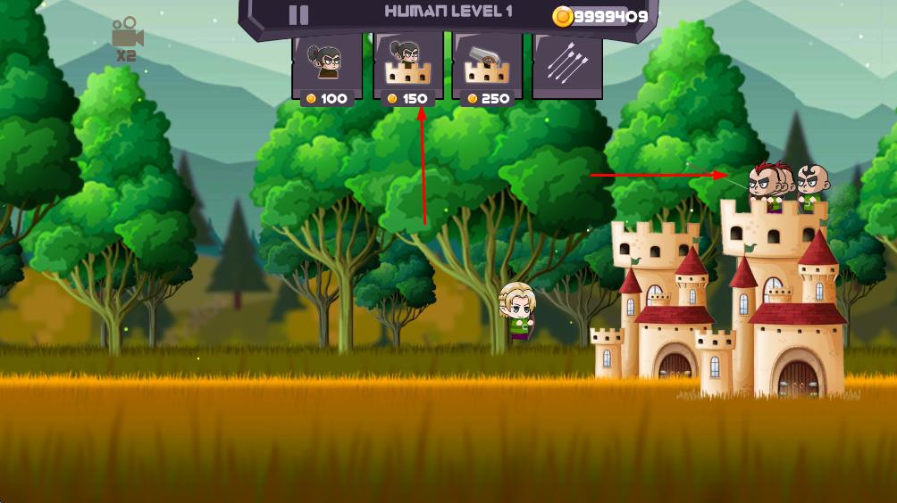 3、敌人靠近城堡时,借助已布置的单位发起攻击,击败敌人可获取金币,用于解锁更高级单位。