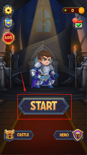 1、开始游戏:看到“ADS START CASTLE HERO”界面,点击“START”按钮进入游戏。