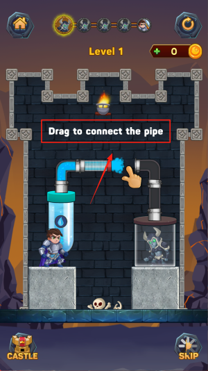 2、进入关卡:出现“Level1 0 Drag to connect the pipe”提示时,用手指拖动水管部件完成连接,也可点击“SKIP”跳过。