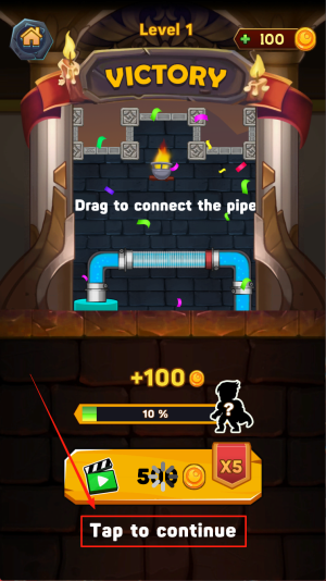 4、领取胜利:当画面显示“Level1 +100 VICTORY Tap to continue”,点击屏幕继续领取奖励并进入下一关。