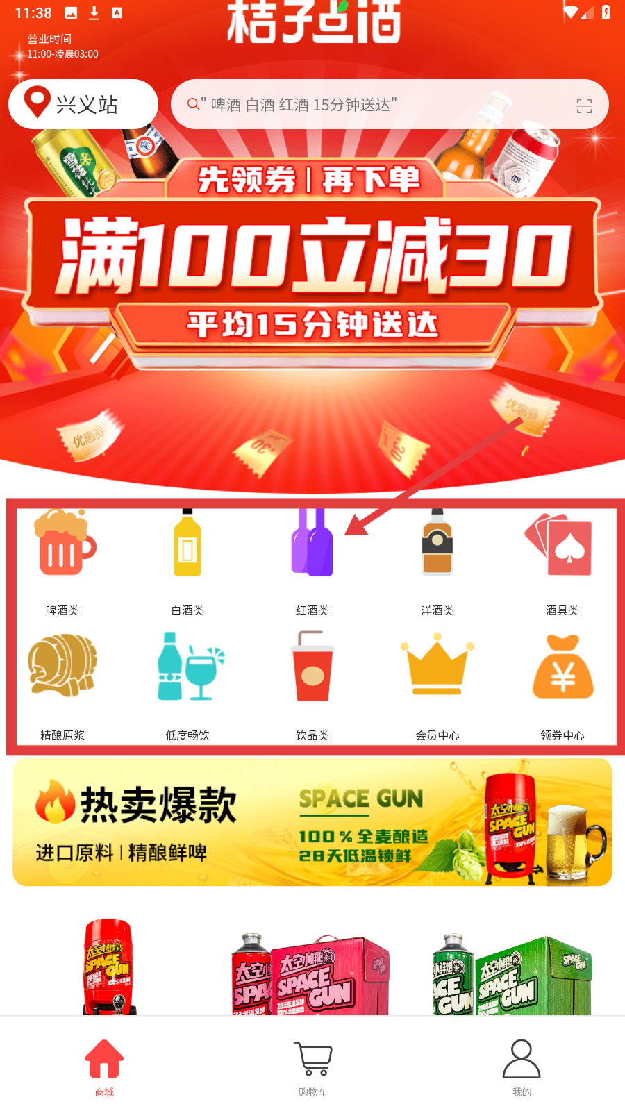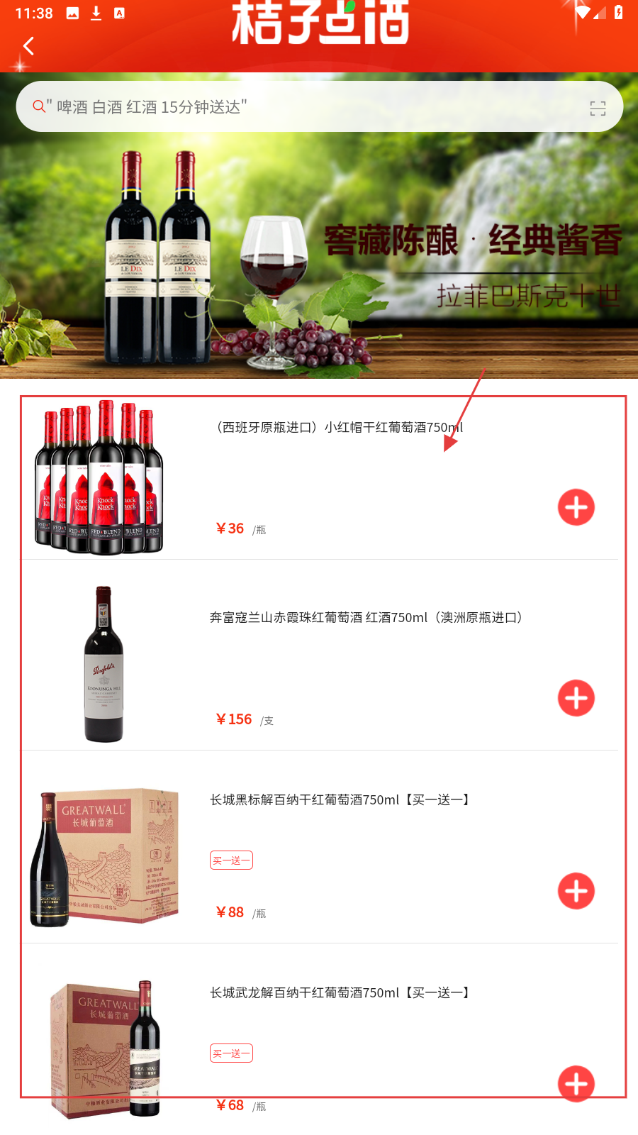 1、商城首页选【红酒类】图标,进入对应酒水分类页面。