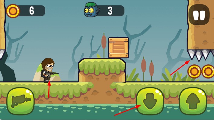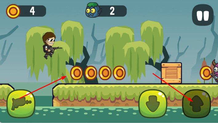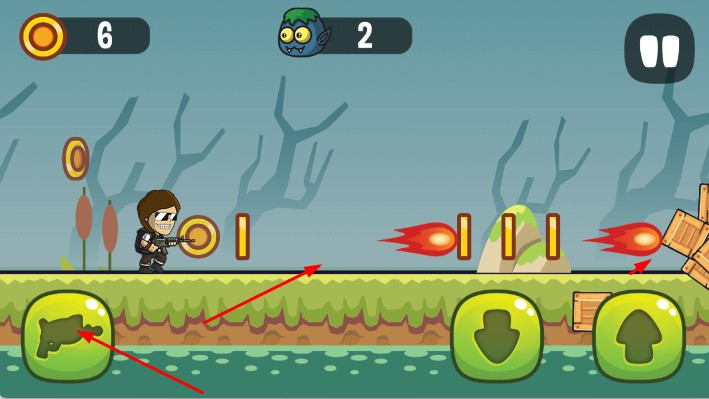 1、进入游戏,在初始界面,点击右下角红色按钮,点击左下角类似枪形的按钮进行射击,消灭前方遇到的怪物和障碍。