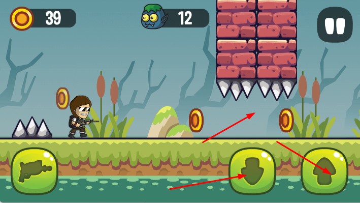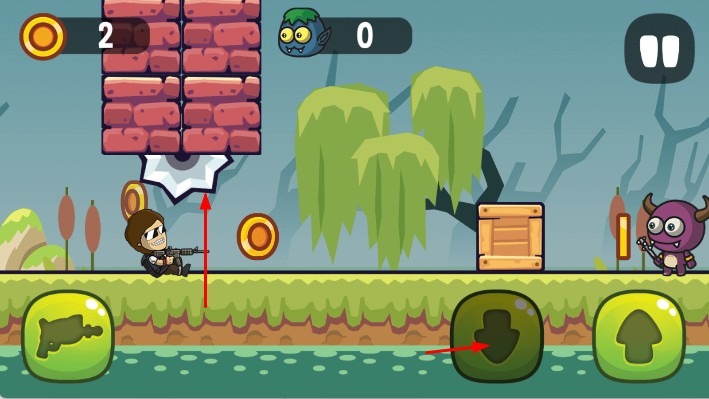 3、利用下方中间的下箭头按钮控制角色下蹲,躲避敌人攻击或穿过较低的通道,成功消灭所有怪物和障碍后,即可通关。