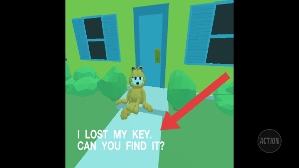 2、到达房屋门口发现了一个加菲猫,似乎有点诡异,但需要与它进行对话,获得一些线索。