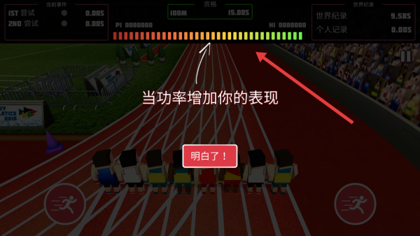 2、比赛时紧盯顶部功率条,高频点击/滑动左侧跑步按钮,维持功率条向绿色区域延伸,借高功率提升冲刺速度。