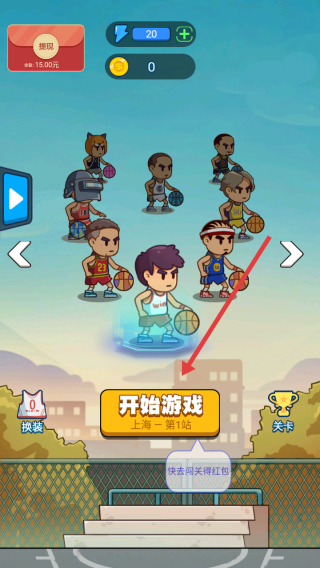 1、点击开始游戏,选定球员,进入篮球闯关游戏第001关,在有上海地标、萌趣角色的街道球场,开启进球1/3挑战。