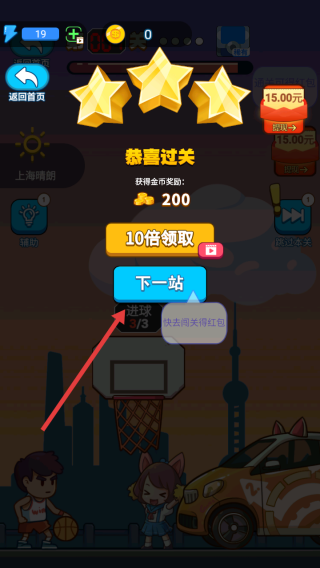 3、过关后领200金币、三星评价,点下一站进新关卡,重复挑战攒金币,解锁球员、提升技巧,冲击全三星兑换奖励。