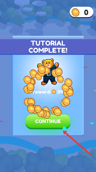 3、在完成全部建筑的夺取后,点击绿色CONTINUE按钮,领取教程完成的34金币奖励,进入游戏下一阶段。