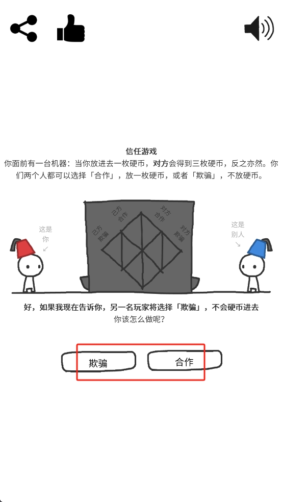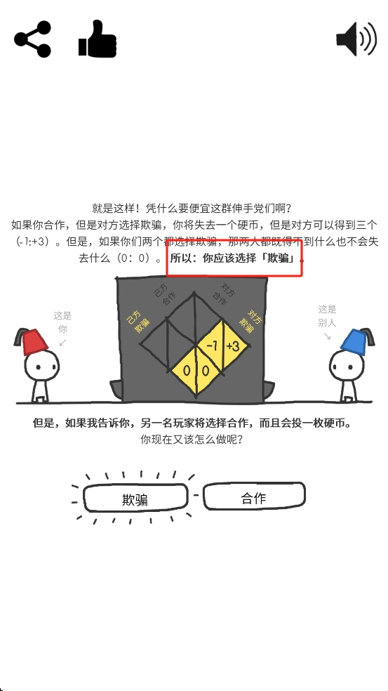 1、进入作品后告诉我们对方会选择欺骗,因此点击界面中的欺骗按钮,依据利益权衡做出决策,避免自身利益受损。