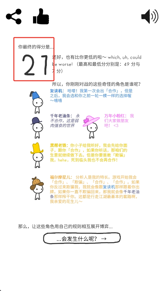 3、完成对战后,界面展示最终的得分有21分,同时下方还介绍复读机、千年老油条等对手的博弈规则。