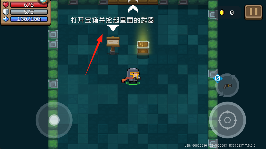 1、操控角色戴头盔、红披风,按提示打开宝箱并捡起武器,靠近发光宝箱互动。