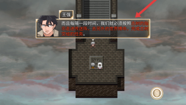 2、观看王强的对话,知晓这个世界的世界观设定,需要按古树指示进入传送阵,前往异世界执行任务。