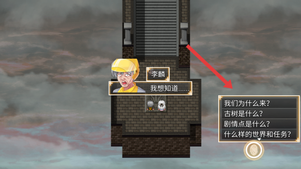3、选择李麟的疑问选项如我们为什么来等,这里建议每一个问题都问一次,获取古树、任务等背景信息。
