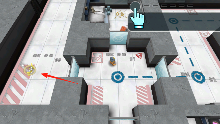 1、在测试房间05、01、02、04场景,操控角色黄色小人,按箭头指引移动。