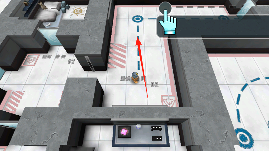 2、跟随红色箭头,经过不同测试房间,点击手型标识互动,完成关卡目标。