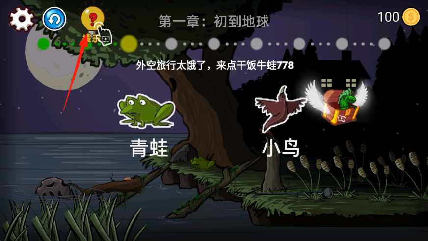 3、遇卡关点提示按钮,获取干饭牛蛙等线索,利用青蛙、小鸟等元素,解开新任务。