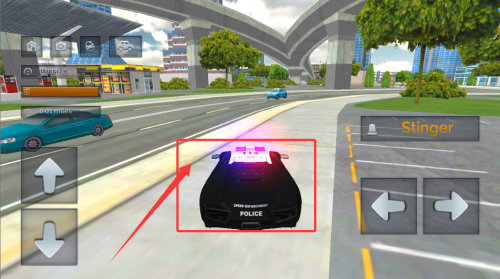 2、操作设计简洁直观,左侧虚拟方向盘控制方向,右侧按键管理警笛与加速,辅助瞄准系统可帮助锁定目标车辆。