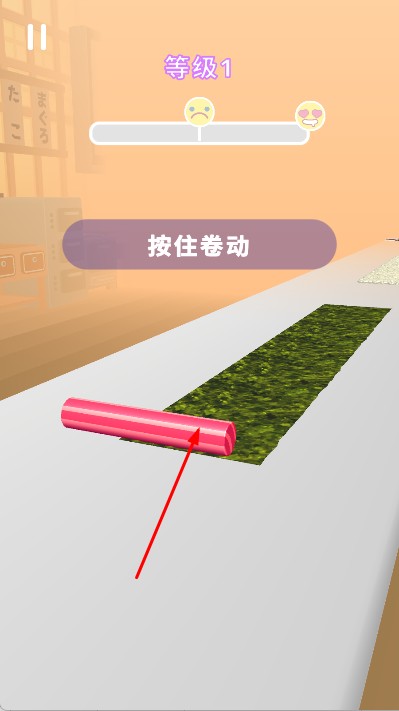 2、在制作界面,根据提示按住卷动,按住屏幕上的粉色卷轴,将海苔等食材进行卷动操作。