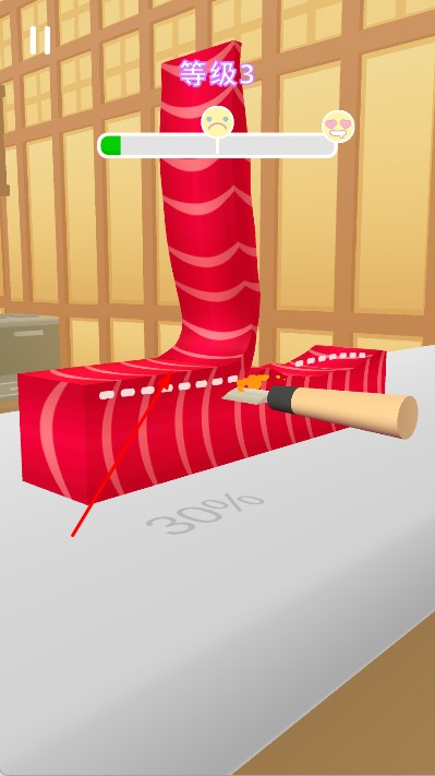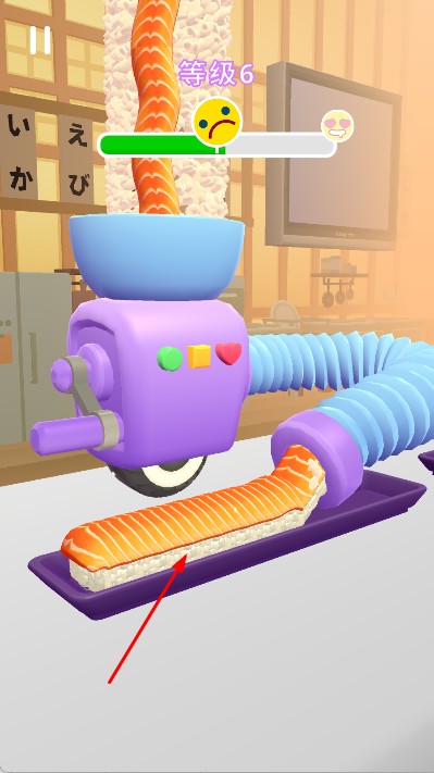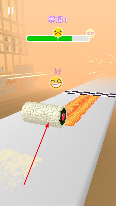 3、在卷动过程中,观察屏幕上方的表情和进度条,了解制作的满意度和进度,将食材制作成寿司卷,完成寿司制作任务。