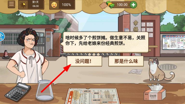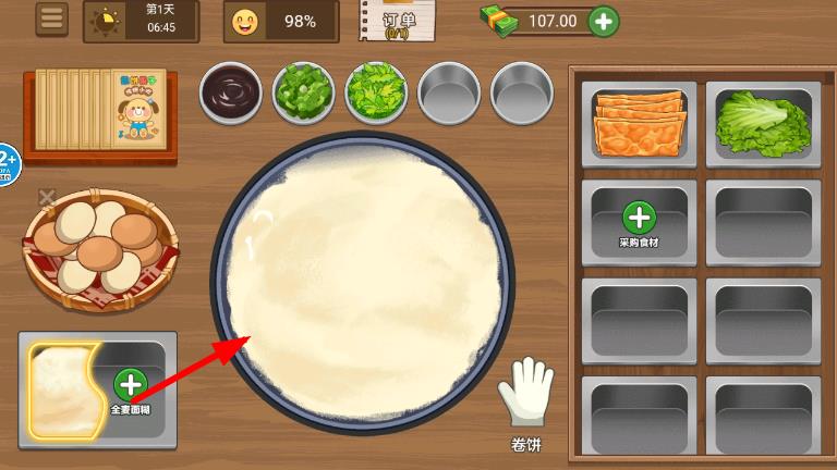 1、进入游戏后,先跟随引导熟悉煎饼果子的制作流程,学习如何把控面糊的用量、摊饼的火候,以及如何快速添加客户指定的生菜、薄脆、酱料等食材。