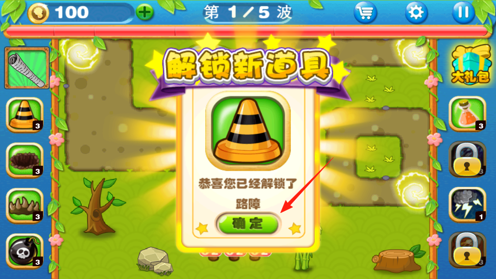 1、弹出解锁新道具路障的提示,点确定收下,之后在关卡里,遇到怪物来袭,把路障放在合适位置,阻挡怪物前进路线,帮蔬菜们更好防守,争取多扛几波攻击。